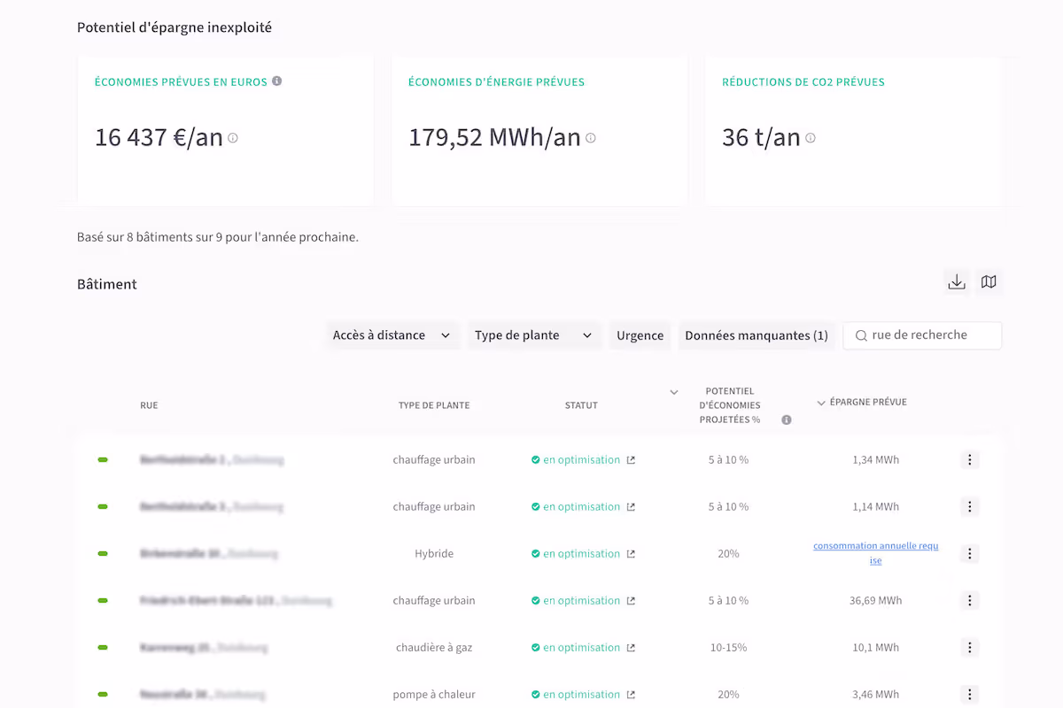 Gaz, chaleur urbaine, pompes à chaleur ou systèmes hybrides : notre plateforme s'intègre à vos équipements existants et les pilote en temps réel, sans remplacement matériel. Déjà adoptée par plus de 200 clients et déployée dans plus de 4 000 bâtiments en Allemagne, elle arrive aujourd'hui sur le marché français.